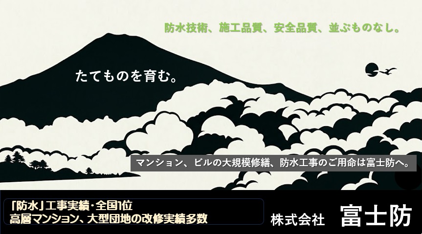 当社は、マンションやビルなど建物の大規模修繕工事、防水 工事の専門会社です。創業以来、防水工事のスペシャリストとして、自社の職人を中心とした自社施工にこだわってきました。技術・ノウハウ・経験を生かした高レベルの施工を信条としています。「たてものを育む」というコーポレートメッセージは、建物の延命化を図るだけでなく、さらに価値を高めていくのだという、当社の「信条」であり皆様との「約束」でもあります。