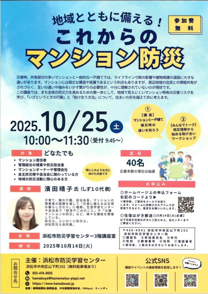 浜松市防災学習センター(浜松市中央区)は10月25日に同所で「地域とともに備える! これからのマンション防災」と題するイベントの開催を予定しており、防災士でしず10代表の濱田晴子氏が講演する。 同イベントは、災害時に周辺 […]